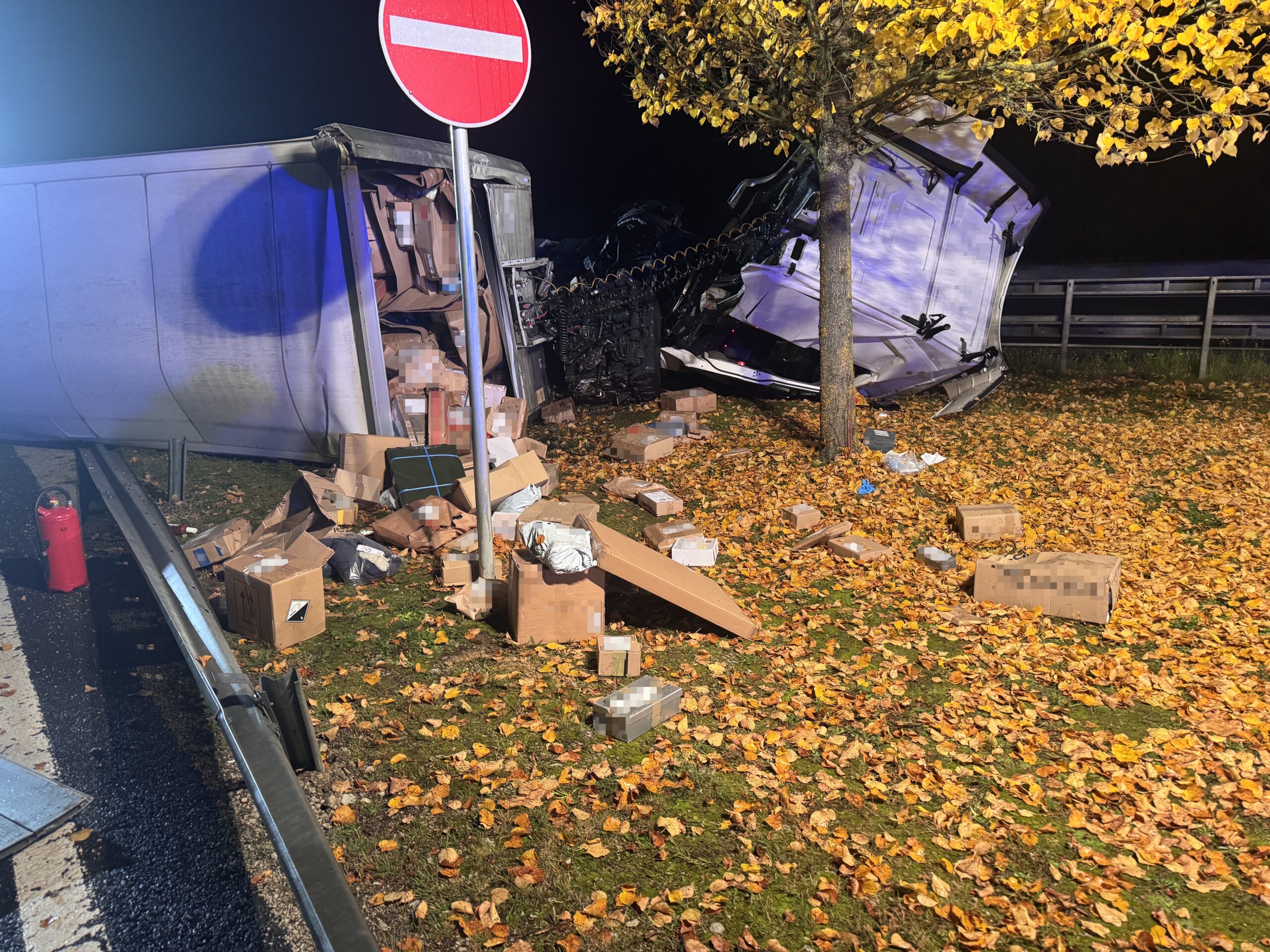 Beim Eintreffen fanden wir einen LKW vor, der mit dem Aufprallschutz der Abfahrt kollidierte und diesen durchbrochen hatte. Aufgrund der Aufprallenergie war das Führerhaus der Zugmaschine nach vorne gekippt. Der Anhänger, der mit Paketen beladen war, kippte auf den Abfahrtstreifen.