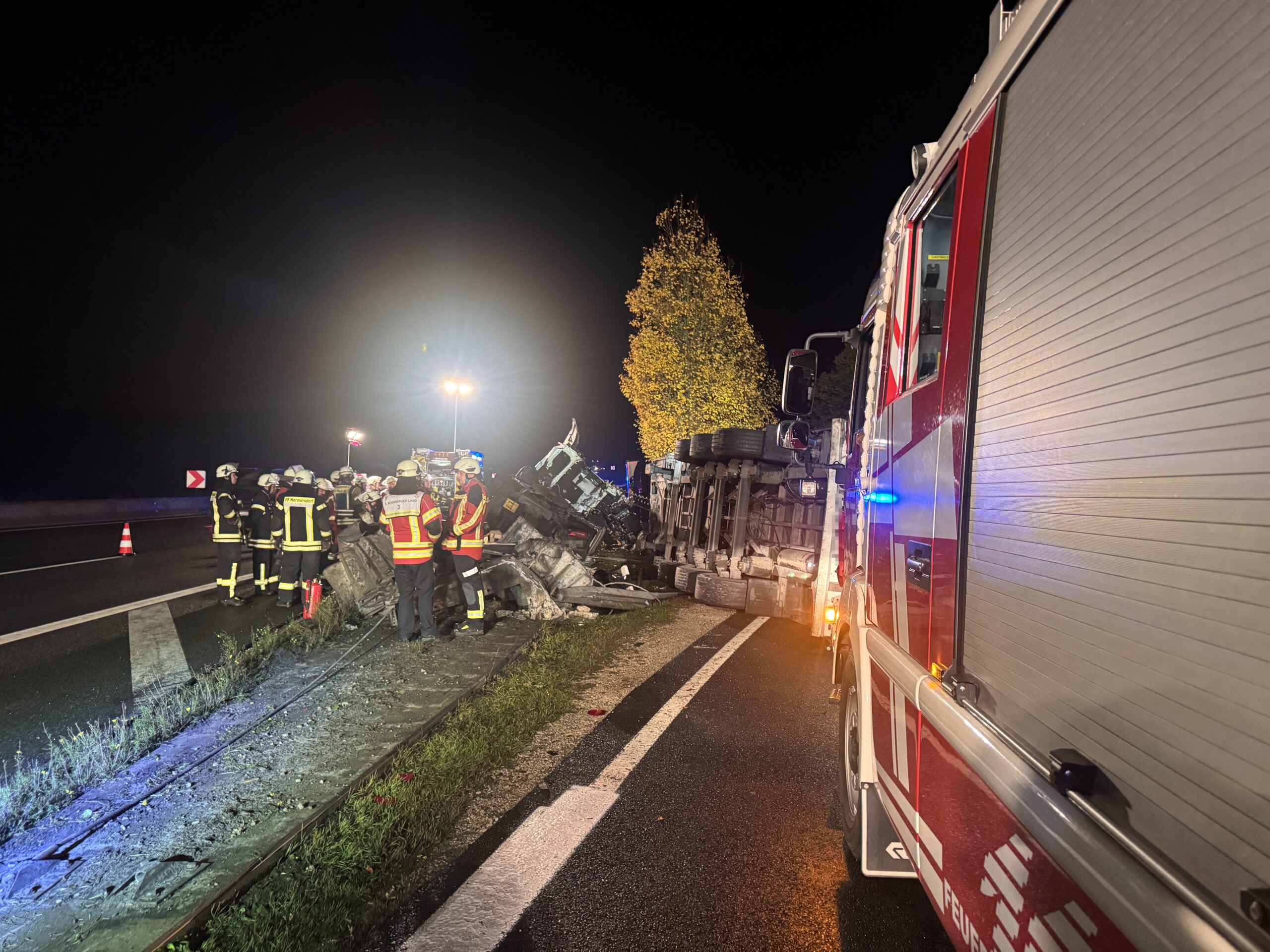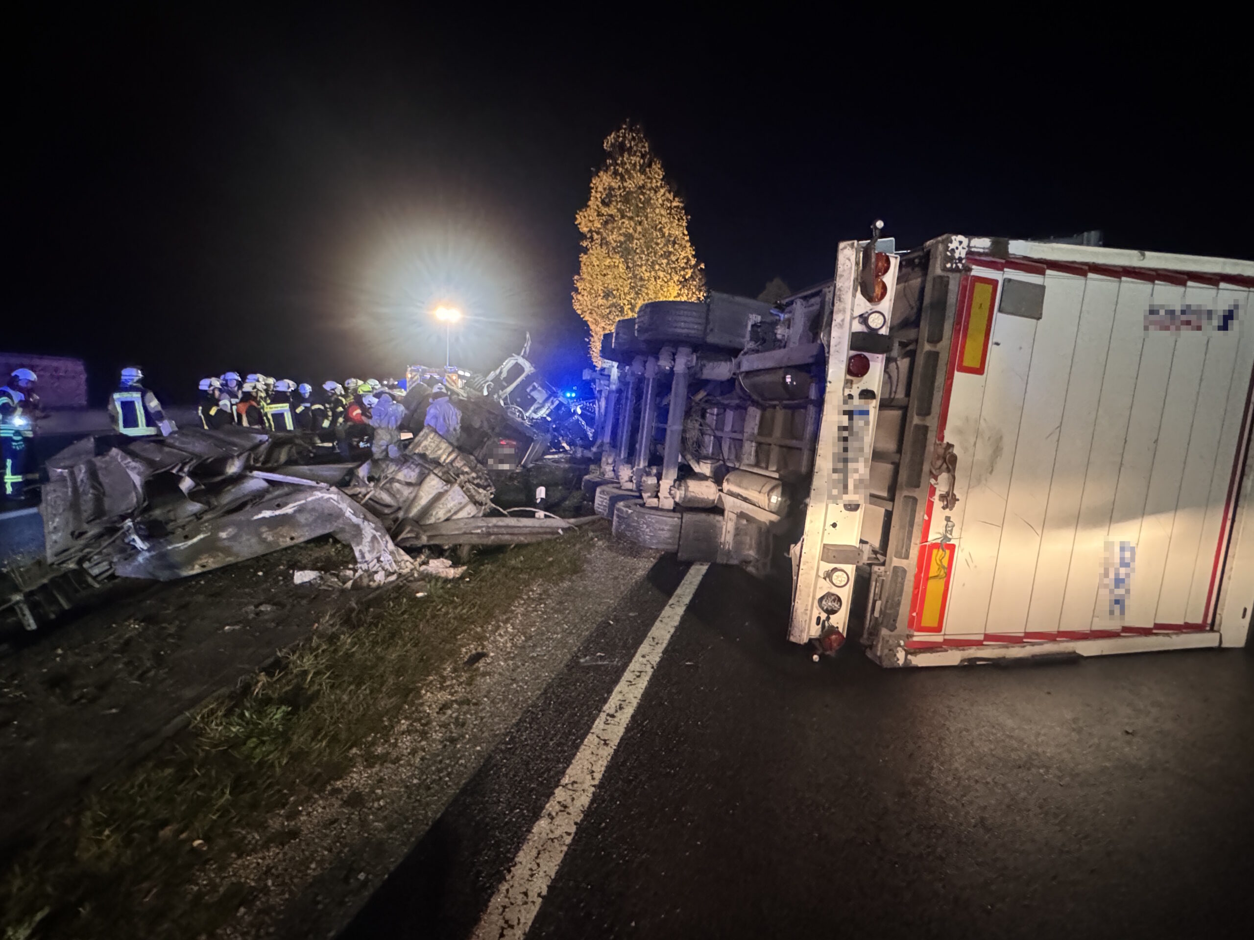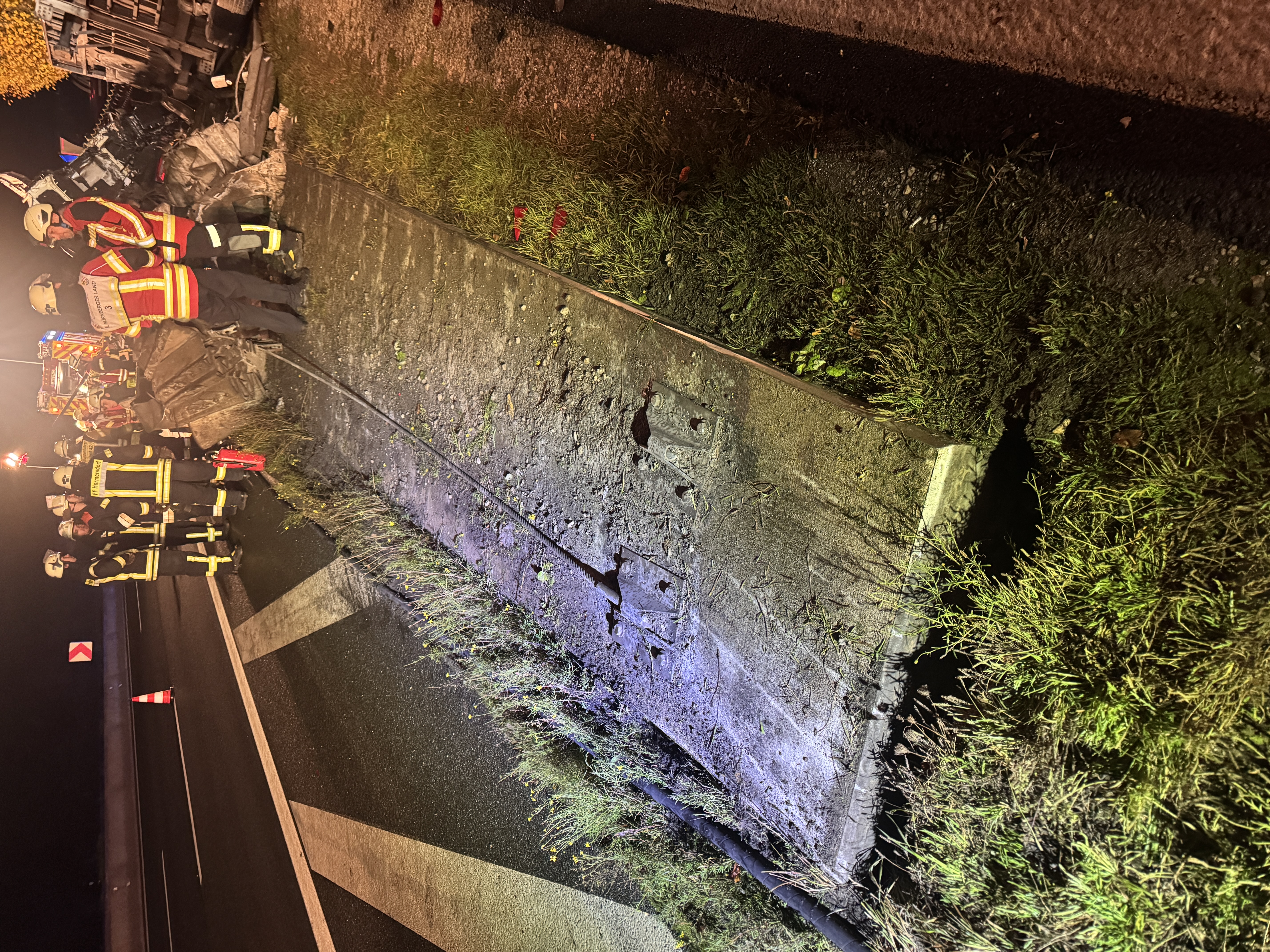 Der Fahrer hatte sein schwer beschädigtes Führerhaus bereits verlassen und wurde beim Eintreffen durch den Rettungsdienst versorgt.