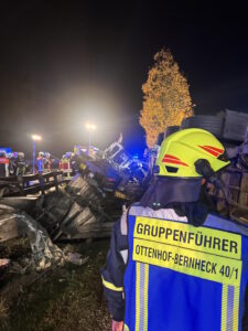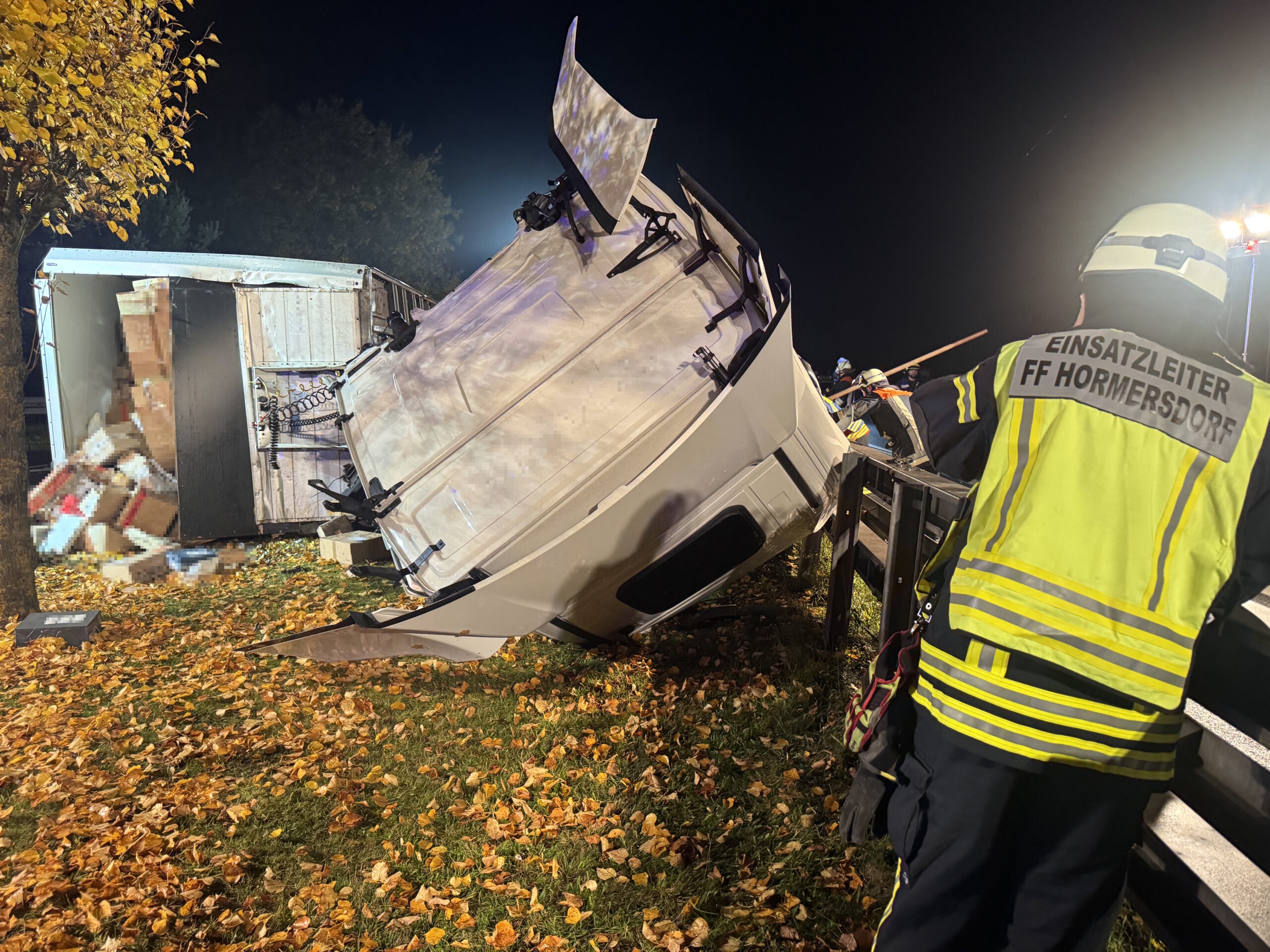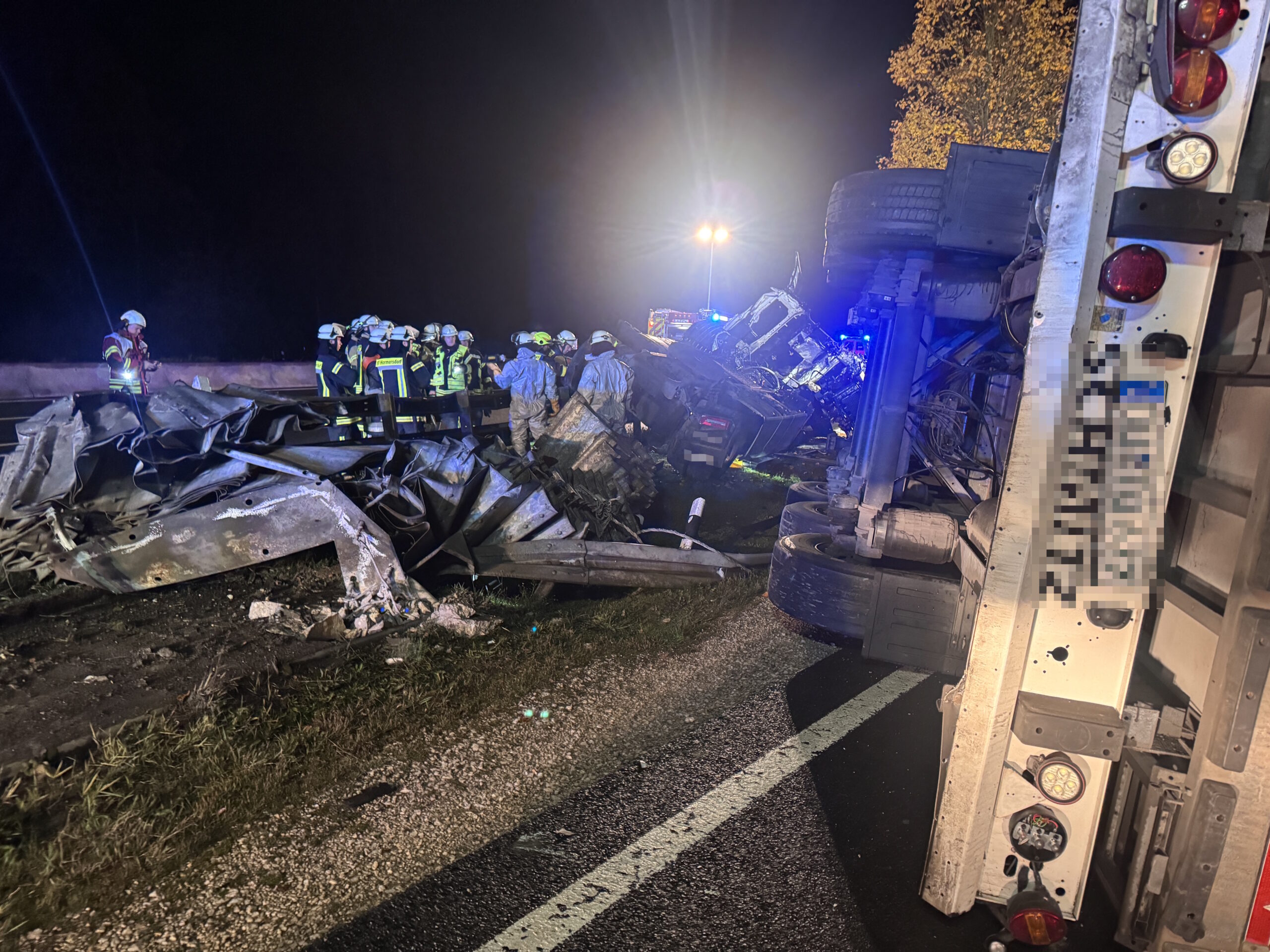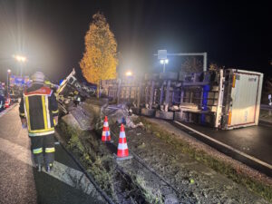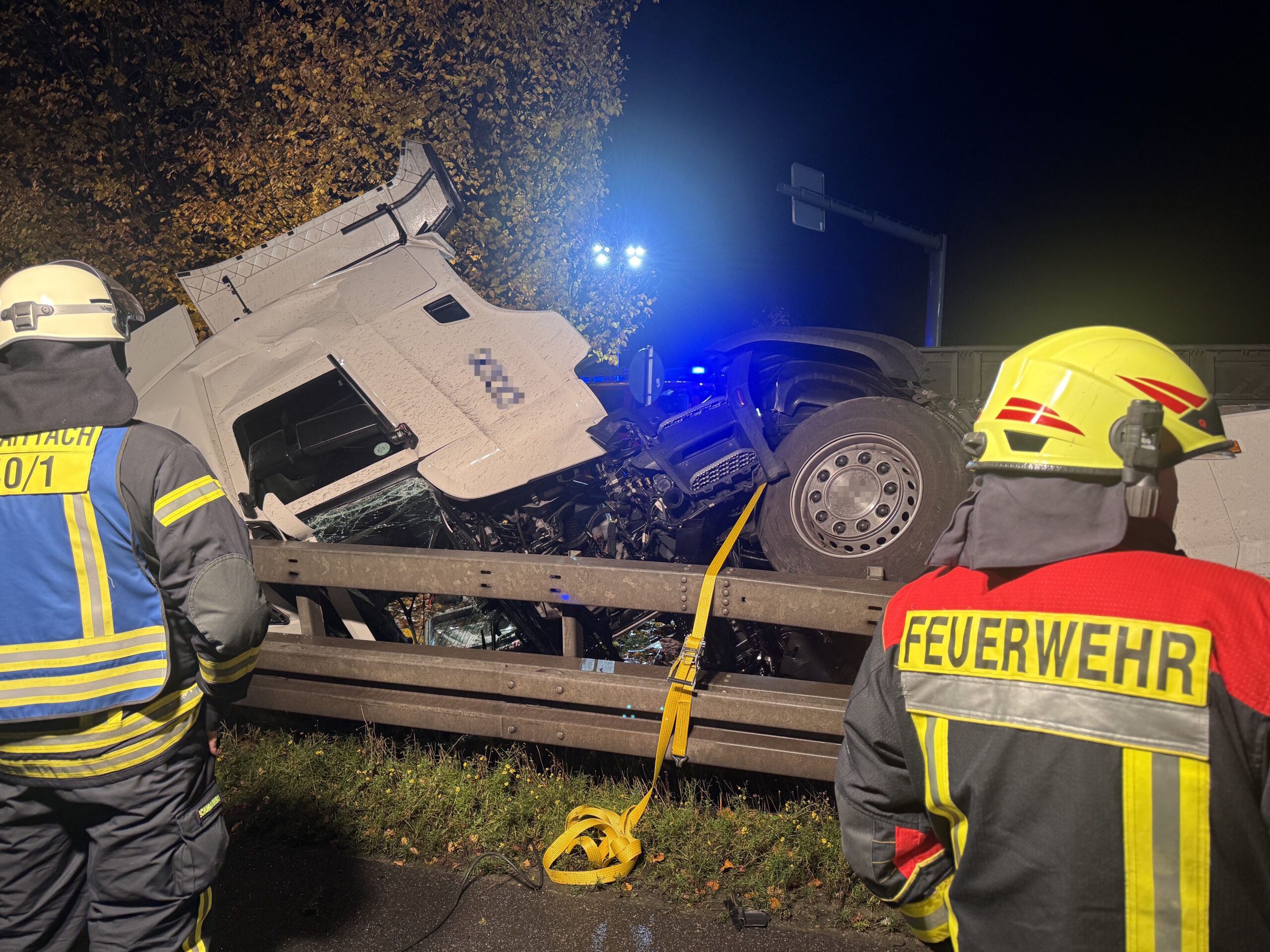 Der Fahrer hatte sein schwer beschädigtes Führerhaus bereits verlassen und wurde beim Eintreffen durch den Rettungsdienst versorgt.