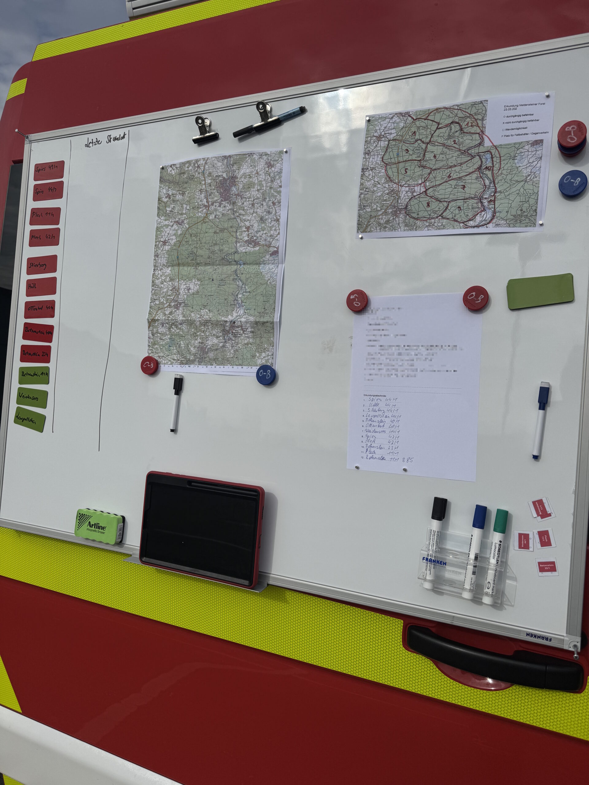 Am Vormittag des 23.03.2025 wurde mit allen Wehren des Unterkreises 10 des Landkreises Bayreuth die Frühjahrsübung durchgeführt. Die Übung bestand darin, die Wege im Veldensteiner Forst zu erkunden, um für zukünftige Einsätze gewappnet zu sein. Hierfür wurde der Veldensteiner Forst in 12 Abschnitte eingeteilt, welche von einzelnen Fahrzeugen erkundet wurden. Jedes Fahrzeug erkundete, welche Wege befahrbar sind und welche Orte sich zum Aufstellen eines Faltbehälters eignen. Dies konnten die Fahrzeugführer in einer Karte eintragen. Unser 11/1 wurde als Einsatzleitfahrzeug eingesetzt und dokumentierte die Übung, führte Standortabfragen (über Koordinaten, W3W sowie GPS-Übermittlung) durch und übernahm einfache Funkaufgaben. Unser 40/1 bekam den Erkundungsabschnitt 6 und erkundete das zugeteilte Waldgebiet. Insgesamt nahmen rund 70 Kräfte mit 13 Fahrzeugen teil.